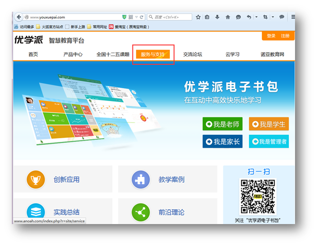 1. 进入优学派主页:https://www.youxuepai.com,找到“服务与支持”,如下图: