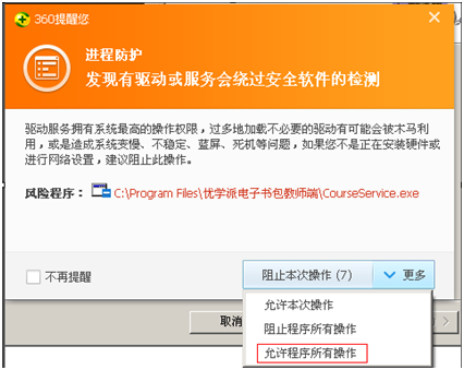 注:安装过程中,360卫士、QQ安全卫士等第三方保护软件,会提示安装保护,请选择“允许程序所有操作”;如下图: